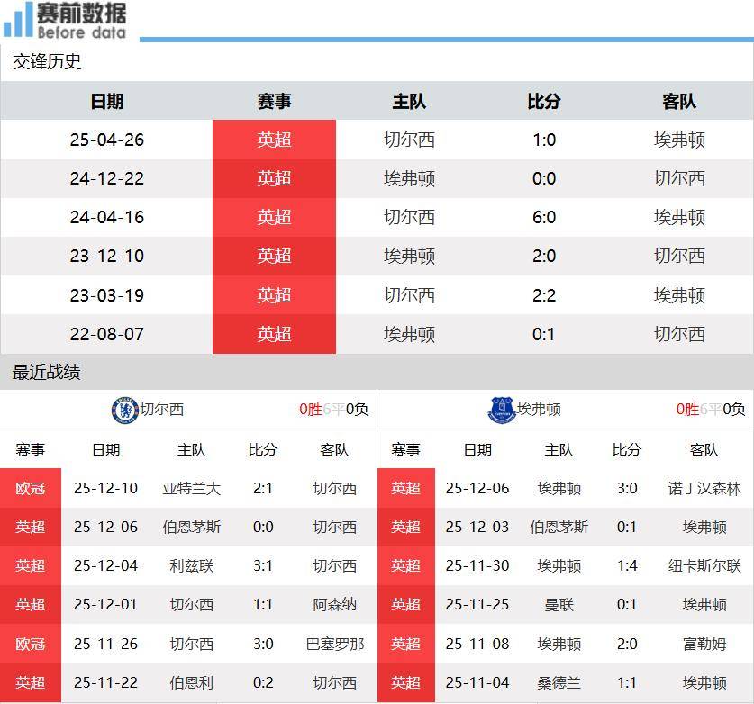 第一:两队情况!英超15轮战罢,切尔西7胜4平4负积25分排名第五,埃弗顿7胜3平5负积24分排名第七,两队仅差1分。上轮英超,切尔西客场0-0战平伯恩茅斯,遭遇3轮联赛不胜,周中欧冠客场1-2不敌亚特兰大,状态低迷;埃弗顿主场3-0大胜诺丁汉森林,近5轮4胜,状态惊人。