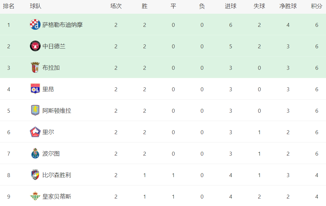 在积分榜上,萨格勒布迪纳摩、中日德兰、布拉加、里昂、阿斯顿维拉、里尔和波尔图都是2战全胜,拿到6个积分。皇家贝蒂斯4分。塞尔塔、罗马和斯图加特都是3分。诺丁汉森林、博洛尼亚和凯尔特人都是1分。返回搜狐,查看更多