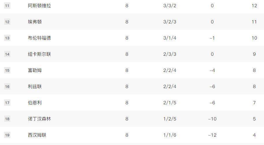 布莱顿、阿斯顿维拉和埃弗顿同积12分,中间还夹着好几支积分接近的球队。 这种紧凑的排名让每一场比赛都变得至关重要。