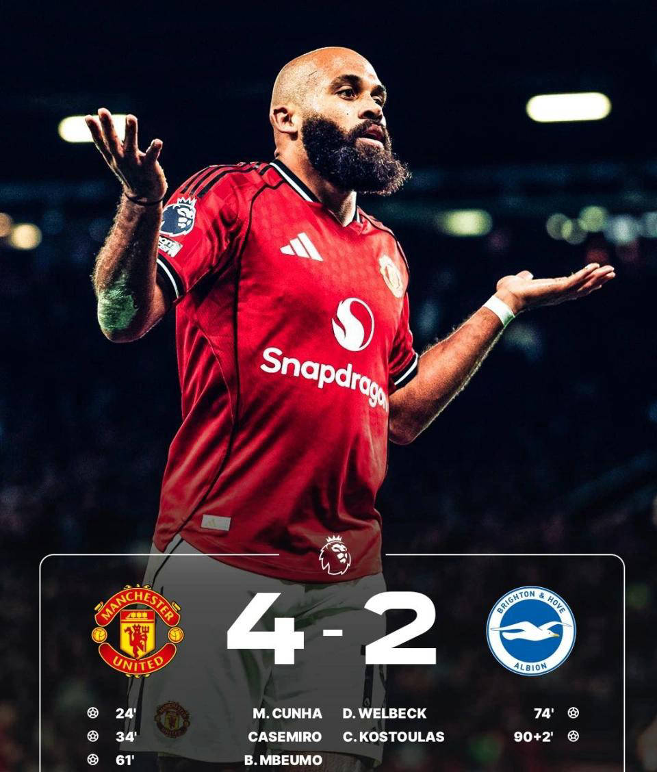 下半场,第62分钟,谢什科传球,姆伯莫得手,曼联3-0领先,优势明显。尽管布莱顿展开猛烈反扑,先是维尔贝克扳回一球,随后科斯图拉斯于第92分钟再进一球,曼联3-2布莱顿,比赛悬念重新升起。