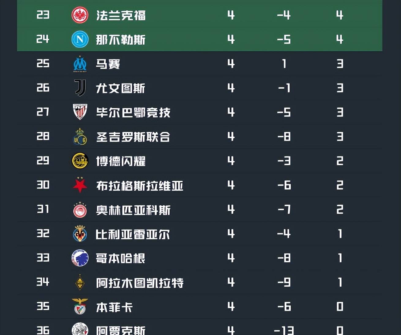 然而,其他的意甲球队表现就不那么理想了。亚特兰大四轮过后以7分排在第16位,已经是继国米之后意甲排名最好的球队。而去年的意甲冠军那不勒斯,前四轮仅积4分,排在第24位,甚至在上一轮被荷甲的埃因霍温以6-2痛击。尤文图斯的情况也不容乐观,他们四轮过后未尝胜绩,排在第26位,深陷淘汰赛区。