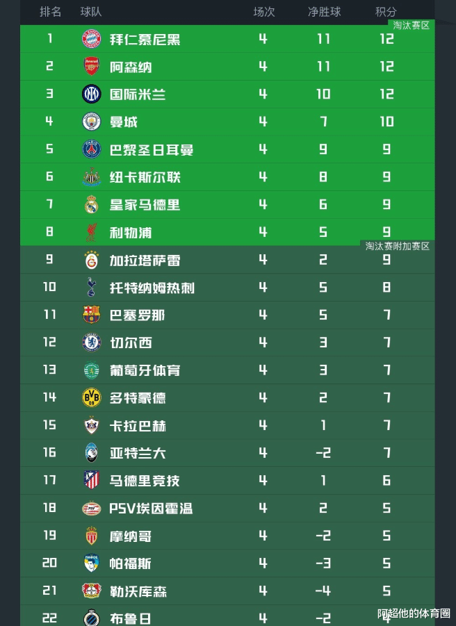 曼城在本轮以4-1大胜多特蒙德,取得了3胜1平的成绩,积10分排在第4位;而大巴黎、纽卡斯尔、皇马、利物浦和加拉塔萨雷则以3胜1负积9分的战绩,分列第5至第9位。加拉塔萨雷由于净胜球的劣势,暂时未能跻身前八。至此,四轮比赛过后,前八的球队全部来自五大联赛,其中英超球队占据了四个席位。