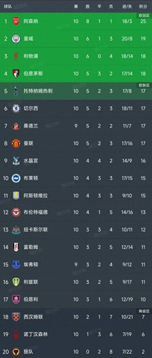 英超直播,英超赛程,英超积分榜,英超比分预测,曼联利物浦直播/覆盖2025年英超联赛所有比赛,提供免费高清中文直播入口、最新赛程安排、实时积分榜、比分预测与波胆分析,聚焦曼联、利物浦、曼城、阿森纳等豪门动态。北京时间11月3日,英超第10轮的比赛落下帷幕,曼城以3-1战胜了伯恩茅斯,西汉姆联也以同样的比分逆转击败了纽卡斯尔联。让我们一起看看最新的积分榜情况。
