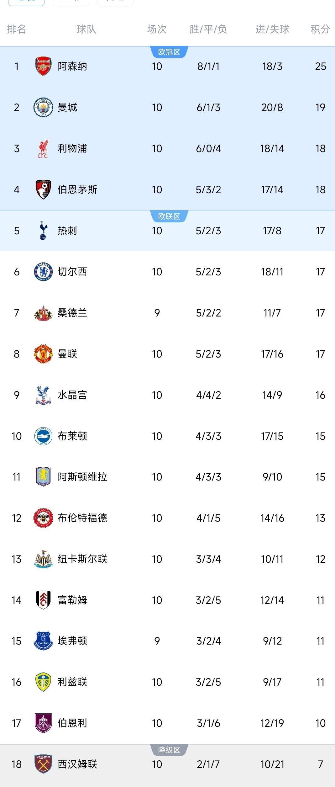 放眼整个积分榜,阿森纳依旧以25分高居榜首,他们那条10场比赛仅失3球的钢铁防线,令人叹为观止。曼城以19分紧随其后,而从第三名的利物浦(18分)到第八名的曼联(17分),分差仅仅只有1分。