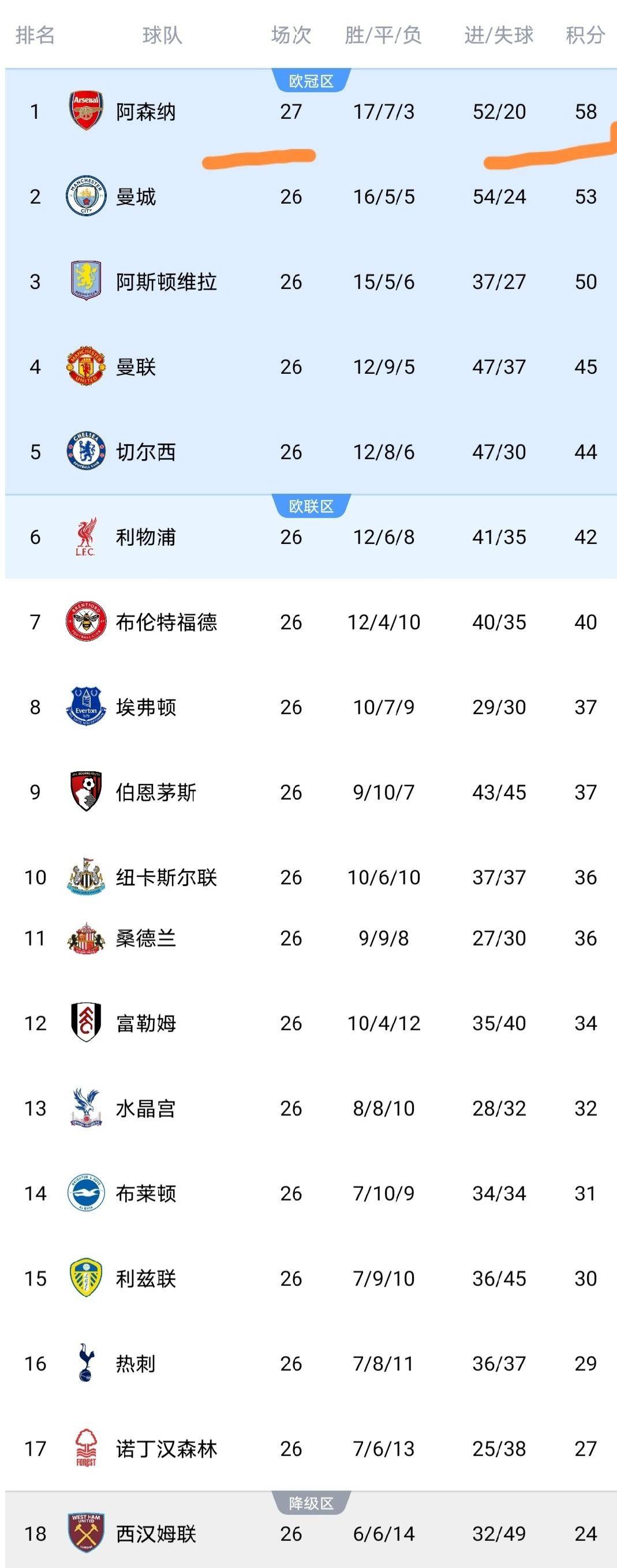 曼城少赛一场,26轮积53分。 这意味着,阿森纳在多赛一场的情况下,对曼城的领先优势只有5分了。 阿斯顿维拉同样少赛一场,积50分排在第三。