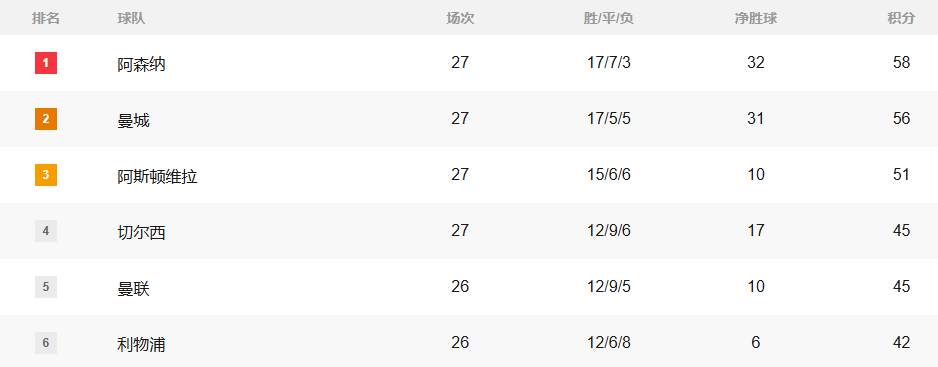这场2:1的比赛过后,英超积分榜的形势发生了非常大的变化。阿森纳虽然仍然占据英超榜首的位置,但曼城凭借这场2:1的胜利,积分已经提升到56分,与阿森纳的积分差缩小到了2分。阿斯顿维拉本轮1-1战平利兹联,积分停留在51分,位居第三位,与前两名的差距逐渐拉大,争冠希望愈发渺茫。切尔西1-1被伯恩利绝平后积45分,曼联同积45分,两队分列第四、五位,只能专注于欧冠资格的争夺,已基本退出争冠行列。至于积42分排名第六的红军利物浦,就更加彻底退出英超争冠行列了。
