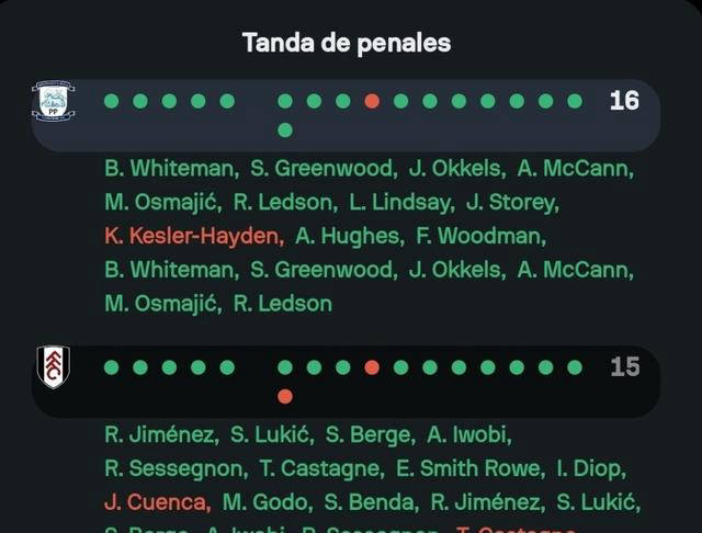 然而,普雷斯顿的后卫凯斯勒-海登的点球被富勒姆门将本达化解,比赛陷入胶着局面,双方不得不继续互射点球。点球大战一直持续到第17轮,富勒姆的卡斯塔涅失去良机,而普雷斯顿队长勒德森稳健命中,最终导致富勒姆遗憾地输掉漫长的点球大战,结束了在本赛季联赛杯的征程。