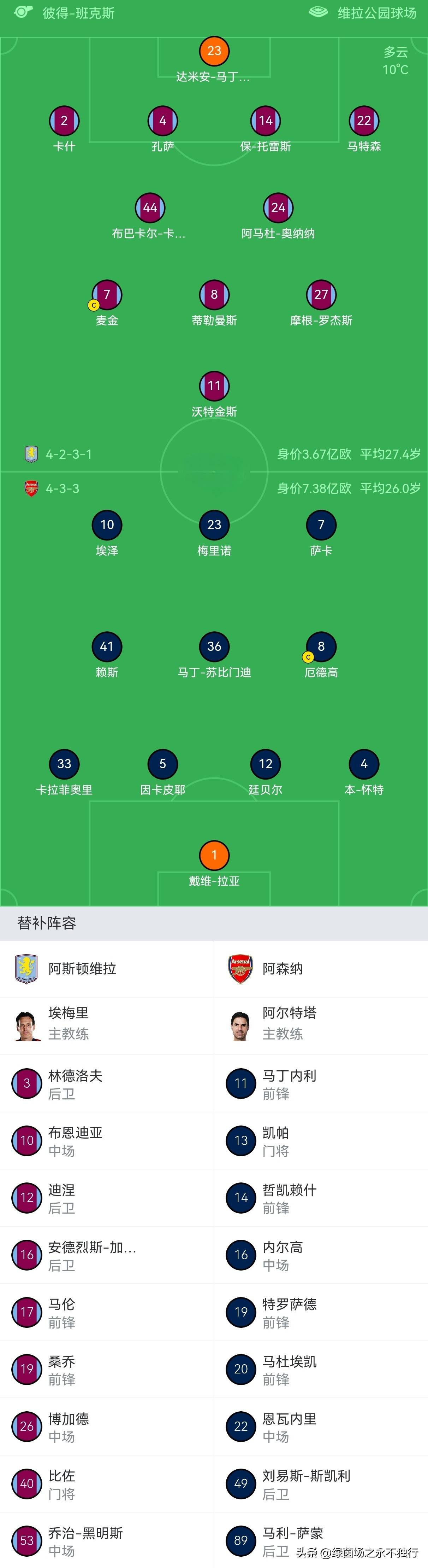在阿斯顿维拉与阿森纳的比赛中,两队近期的表现都非常出色,阿森纳已经连续18场比赛不败,维拉也凭借近期9场8胜的佳绩,从降级区一路冲到了英超第三位。本场比赛,阿森纳的防线由于伤病问题严重受到影响,关键球员如加布里埃尔、萨利巴和莫斯克拉都未能出场。比赛开始后,维拉在第36分钟便通过卡什的凌空抽射首开纪录,阿森纳的门将拉亚未能扑出,维拉以1-0领先。第52分钟,阿森纳通过萨卡的传中,特罗萨德在后点破门,将比分扳平。比赛进行到第90+5分钟,维拉发动猛烈进攻,布恩蒂亚在混战中破门,最终维拉以2-1绝杀阿森纳。