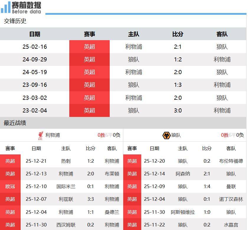第一:两队情况!英超17轮战罢,利物浦9胜2平6负积29分排名第六,狼队0胜2平13负积2分排名垫底。上轮英超,利物浦客场2-1击败热刺,伊萨克进球的同时遭遇重伤;狼队主场0-2不敌布伦特福德,联赛10连败,惨不忍睹。