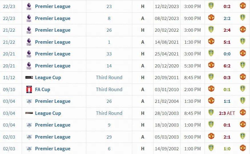 双方近10次交锋,曼联7胜3平保持不败,有一定心理优势。上次曼联英超不敌利兹联还要追溯至23年前,2002-03赛季英超第6轮,利兹联主场1-0小胜。