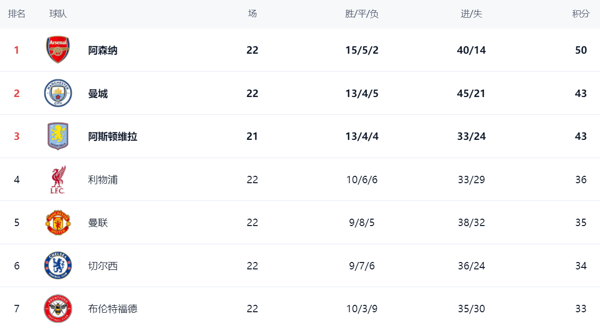 在积分榜上,阿森纳15胜5平2负的战绩,拿到50分,排名榜首位置。曼城连续4轮不胜,丢掉了太多分数,总积分只有43分,屈居第2名,落后了7分。阿斯顿维拉在少赛一场的情况下也是43分,暂时排名第3。利物浦以36分排名第4。曼联总积分达到35分,排名第5,只比利物浦少1分。切尔西34分排名第6。返回搜狐,查看更多