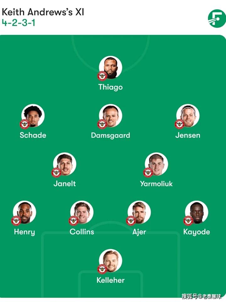 布伦特福德预测阵容(4-2-3-1):凯勒赫、凯奥德、阿耶尔、柯林斯、亨利、亚尔莫柳克、扬内尔特、延森、达姆斯高、沙德、蒂亚戈。