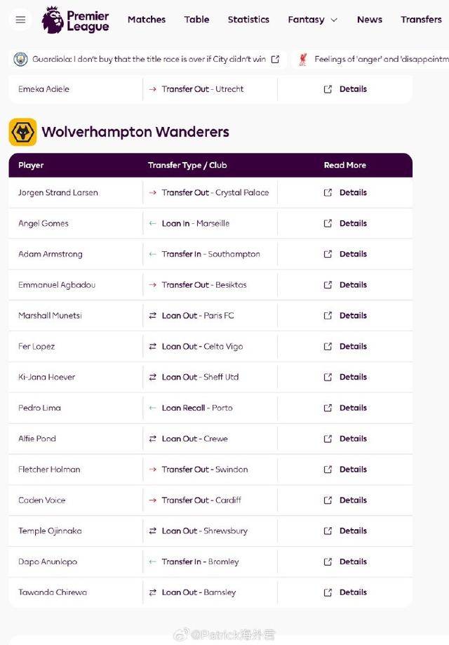 博主“Patrick海外君”于个人微博上详尽记述道:英超联赛官网已全面罗列出 2026 年冬季转会窗口的所有转会情形。然而,令人诧异的是,徐彬加盟狼队以及租借加盟巴恩斯利这两笔备受关注的转会,竟都未现身于该列表。